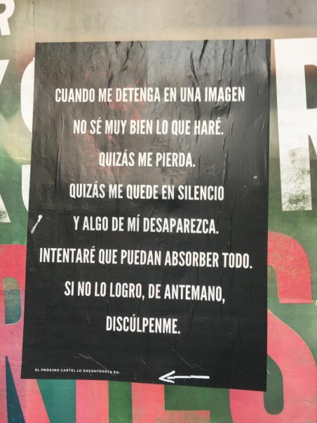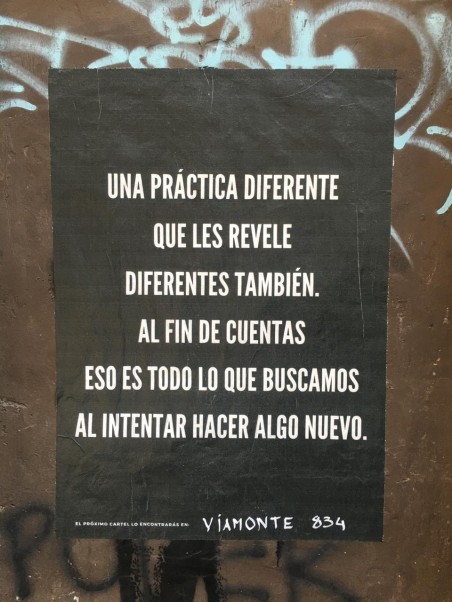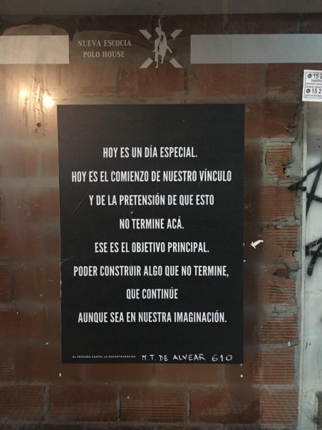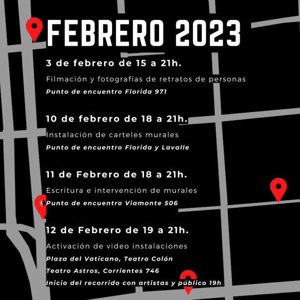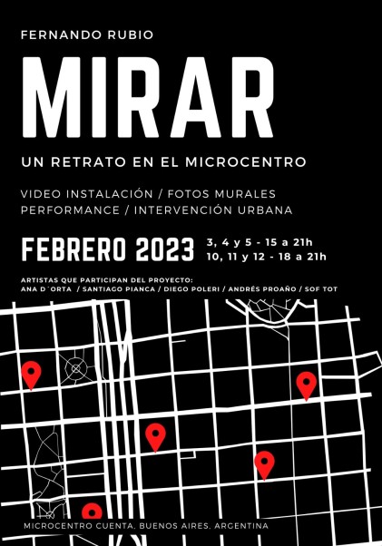 Durante 7 días fragmentos de historias, imágenes y palabras podrán seguirse en diferentes puntos del microcentro. No hay una historia sino partes que completan una mirada inusual y poética para percibir el microcentro. Personas hablándole al mundo. Mostrando algo diferente de la vida cotidiana, en la vida cotidiana. Pantallas en la ciudad, textos escritos como murales, un mapa para ir siguiendo esta relación entre imágenes y palabras a través de las calles, de lugares emblemáticos o no tan evidentes. Contando algo de lo que está detrás de las ventanas y nunca vemos, en todas esas casas, oficinas, bares.